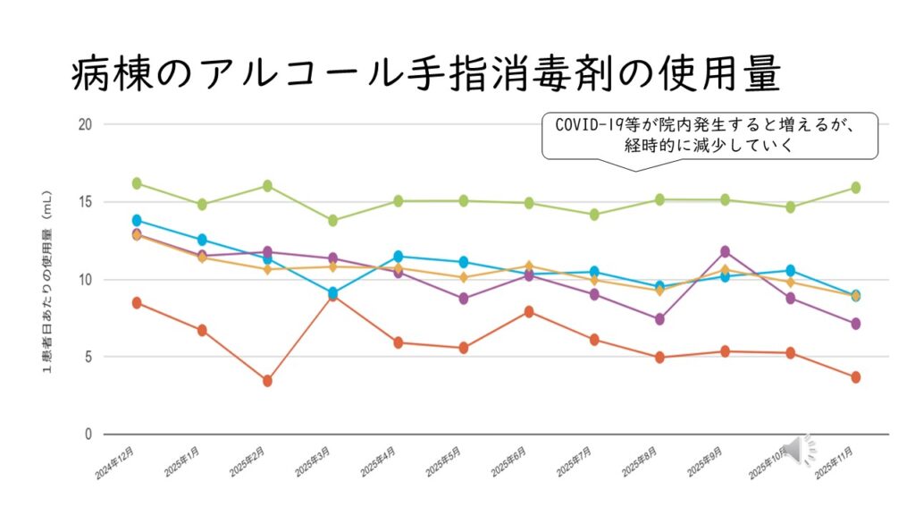 COVID-19の院内発生時には一時的に消毒薬の使用量は増えますが、時間の経過とともに減少していく傾向が顕著に現れていました。
